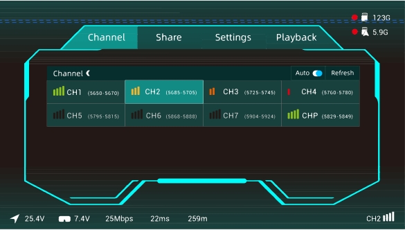 The goggles support up to 8 channels with 20MHz bandwidth (varies by region). First-time users are advised to update to the latest firmware.