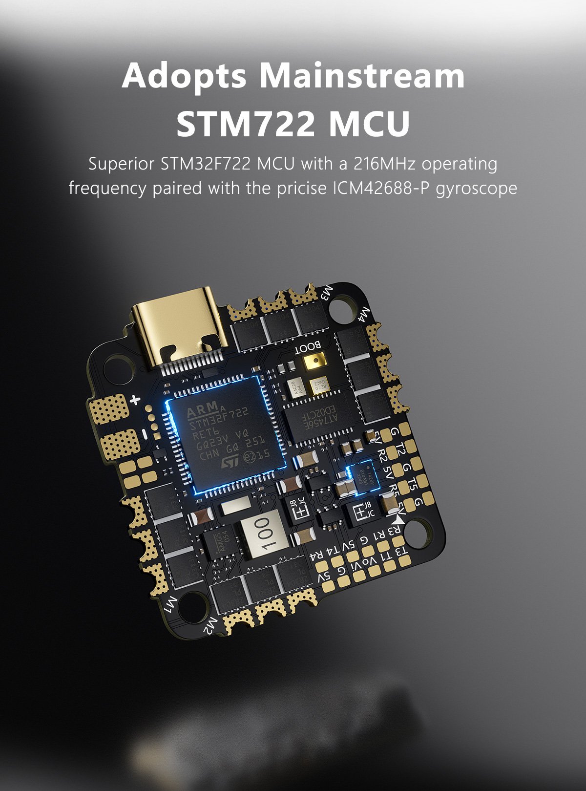 STM32F722 MCU for fast data processing and stable flight.