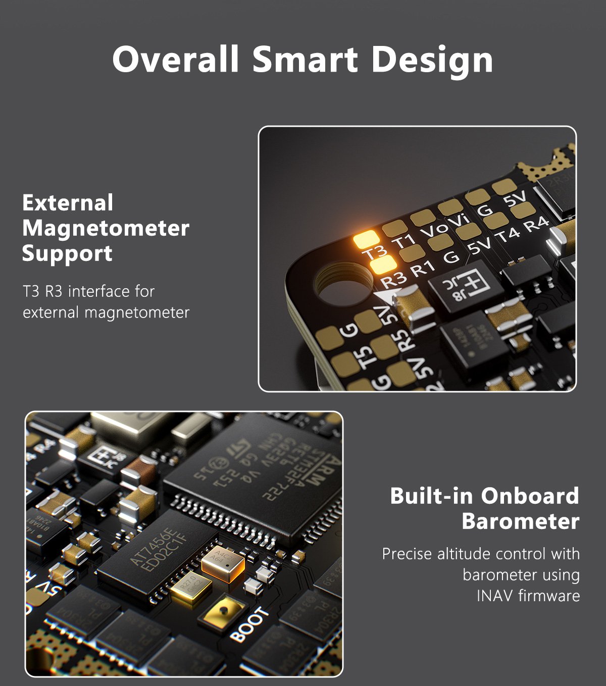 Built-in barometer with INAV compatibility for advanced flight features.