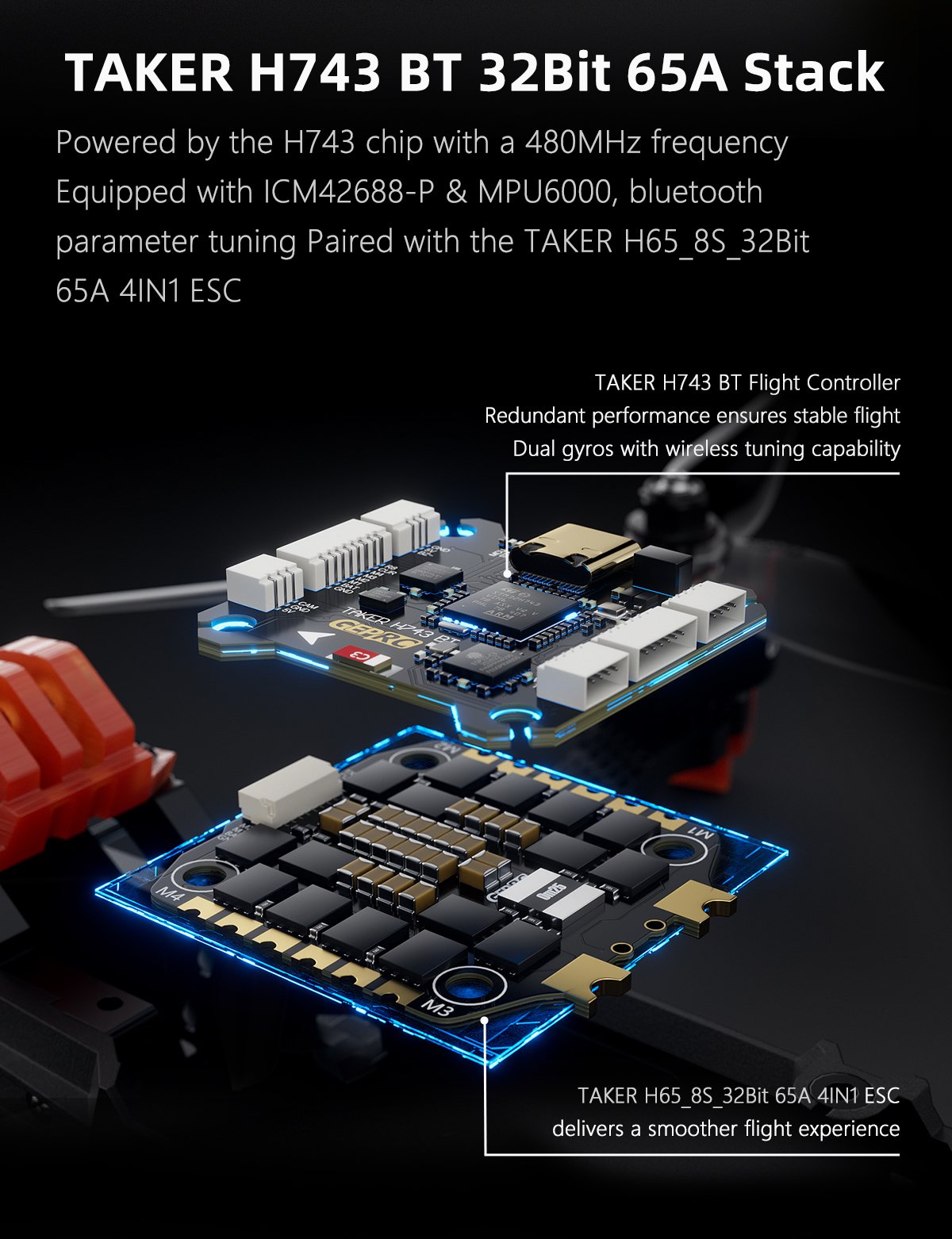 TAKER H743 BT flight controller with dual gyros provides fast, reliable data processing.