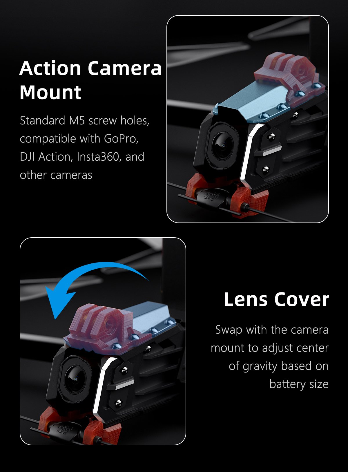 Interchangeable action camera mount allows flexible shooting angles.